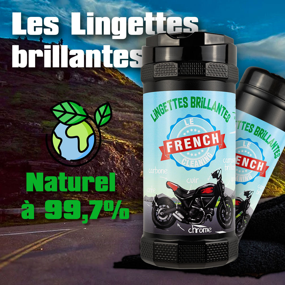 Les lingettes brillantes nettoient sans aucuns efforts sur toutes les parties de la moto, le passage ensuite de la microfibre donne un rendu ultra éclatant sur les parties peintes, sur la fourche, les pots d'échappements et sur les plastiques! je suis super satisfait du rendu final. Je conseil vivement ces produit pour avoir une moto comme neuve. Merci a toute l'équipe car enfin des produits Français, naturel et qui n'attaquent pas les mains.