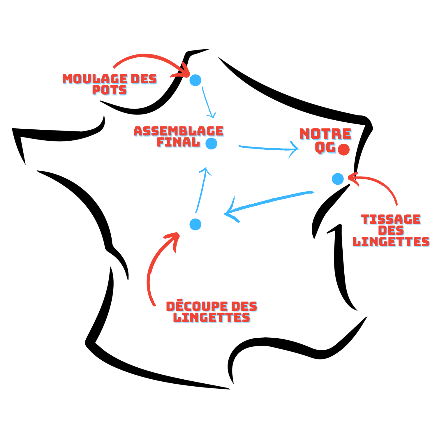 Ca part du moulage de nos pots qui sont faits près de Calais dans le nord jusqu'au tissage de nos lingettes en Alsace